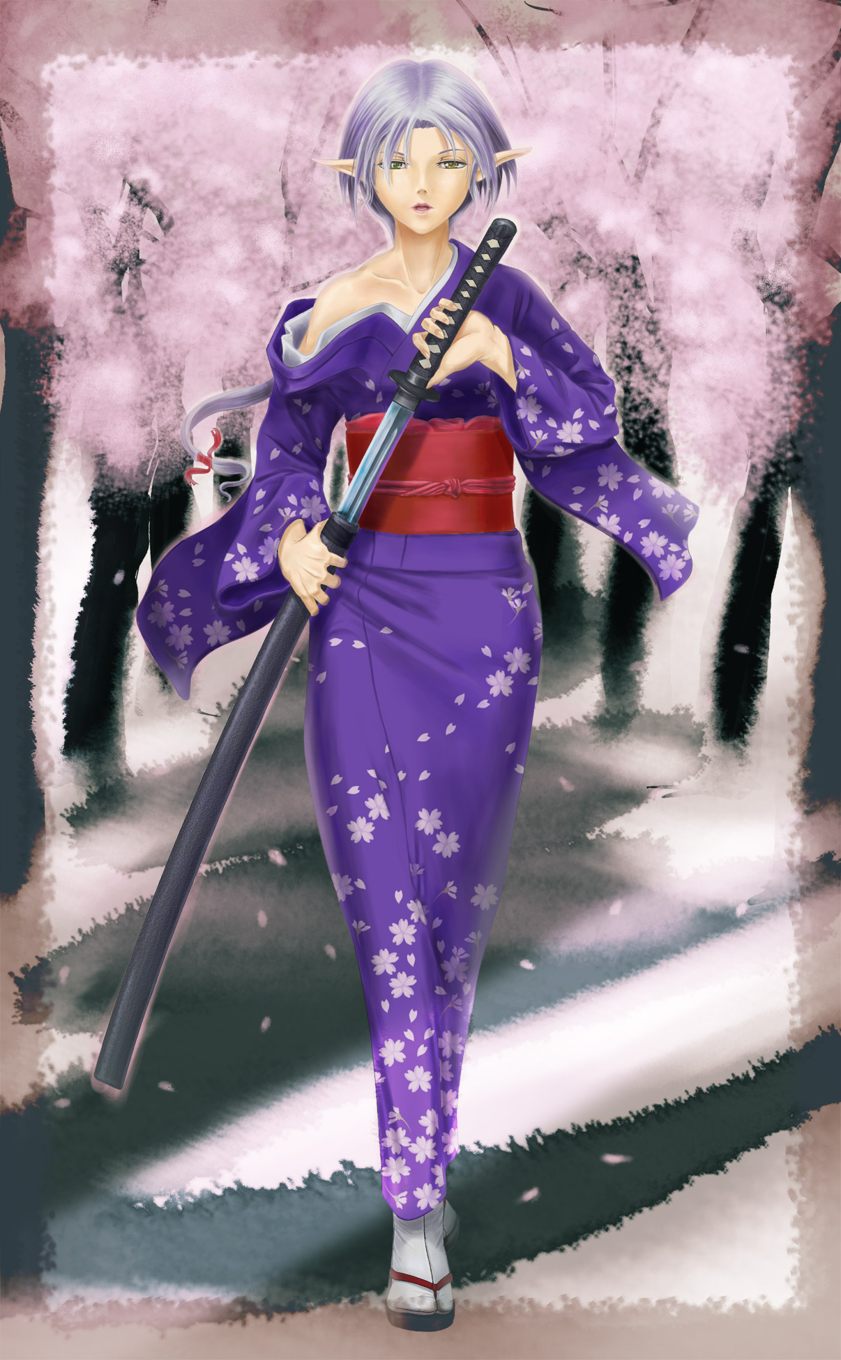 コンセプト的に考えていたのは、(はだけた)着物、桜、同田貫(刀)、目隠し。エルフ耳は大前提です。はい。